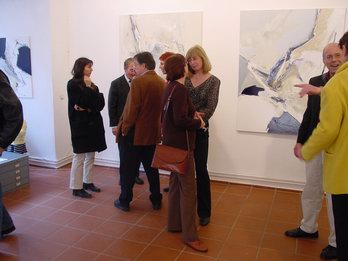 Genau hinsehen war also schon immer seine Sache. Nun erschloss er für sich auch die Räume des Hörens, der Musik, des Lichts - Bewegung -und -Tanz. Körper faszinieren ihn. Die mediterrane Leichtigkeit zieht ihn an, das lichtdurchflutete Ibiza weckte seine Lust, wie die von vielen Malern zuvor. Weiß, diese Nichtfarbe, wird vielleicht auch deshalb Teil seines Lebensgefühls aber auch eine riesige Projektionsfläche für seine Ideen. Außer gewissen Ordnungsprinzipien spricht man dem Weiß auch zu, für Leichtigkeit und Illusion zu stehen - für ihn Ausgangspunkt seiner Malerei. Seiner Musikalität entsprechend und nicht von ungefähr findet er den Weg zur nicht figurativen Malerei, entdeckt Informel und Tachismus. Allerdings ist schnell klar - nicht ein - ismus interessiert ihn, seine Bilder sind nicht Gegenstandslos. Es sind auch keine geometrischen Abstraktionen - was ja vielleicht obgrund des beruflichen Hintergrundes nahegelegen hätte - sein Gegenstand wird die Bewegung. Der Tanz, Körper in Bewegung, Emotionen und Musik sind es, was er in seiner Malerei einfangen möchte. Schnell aufs Papier geworfene Gesten - in Acryl und Lack fixierte Rhythmen. Zum Weiß gesellt sich Blau - zunehmend a deeper kind of - auch Sand, manchmal andere Einsprengsel der realen Welt - z.B. Stoffreste. Die Auswahl seiner Farben hält er gering. Neben den Polen Weiß und Blau mischt sich erdfarbenes, ein relativ helles Grau - manchmal träumt er vom Gelb, welches im Ruf steht die Farbe der Meister zu sein. Doch meist belässt er es bei einigen wenigen Tupfern. Aber immer wieder Weiß - in mancherlei Brechung - mal glatt und lackiert, mal aufgeschichtet und mit Quarzsand versetzt.